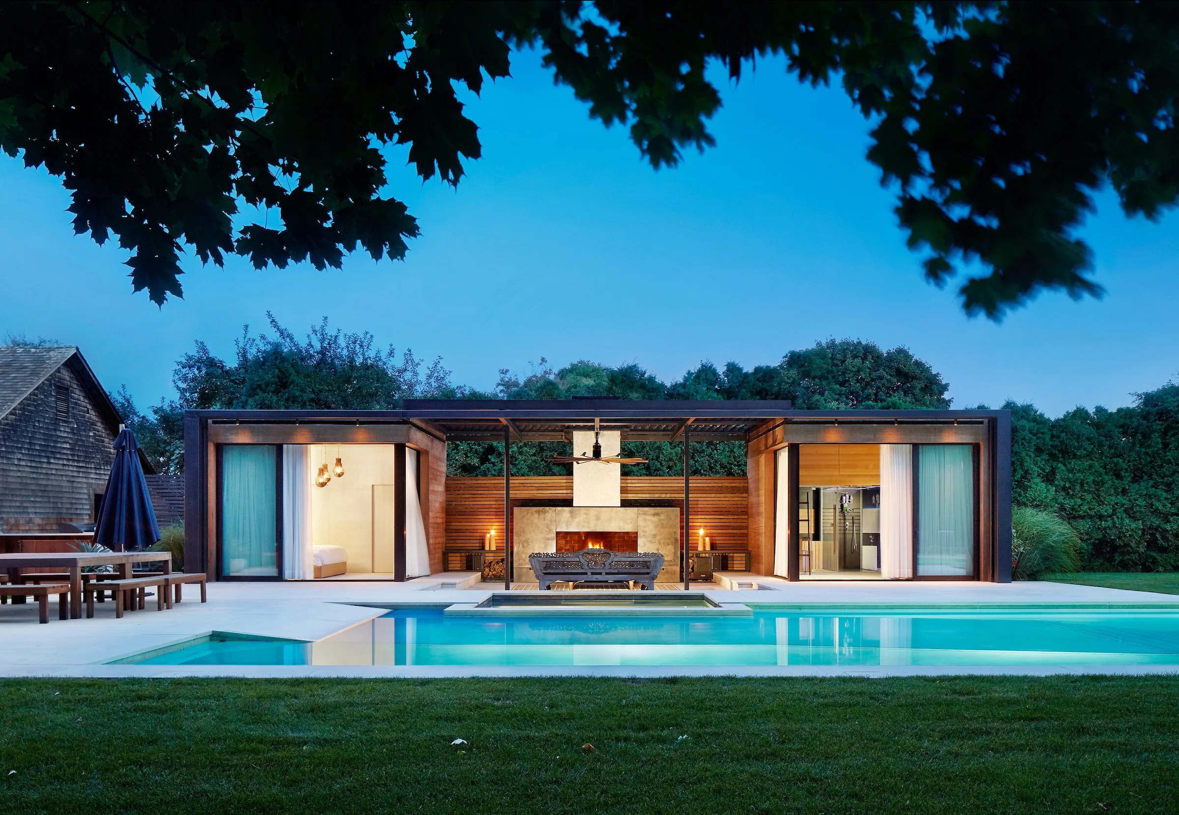 Ultra-modern and designed for seasonal living, the pool house in Amagansett, NY includes a guest suite, spa, hot tub, and outdoor fireplace.